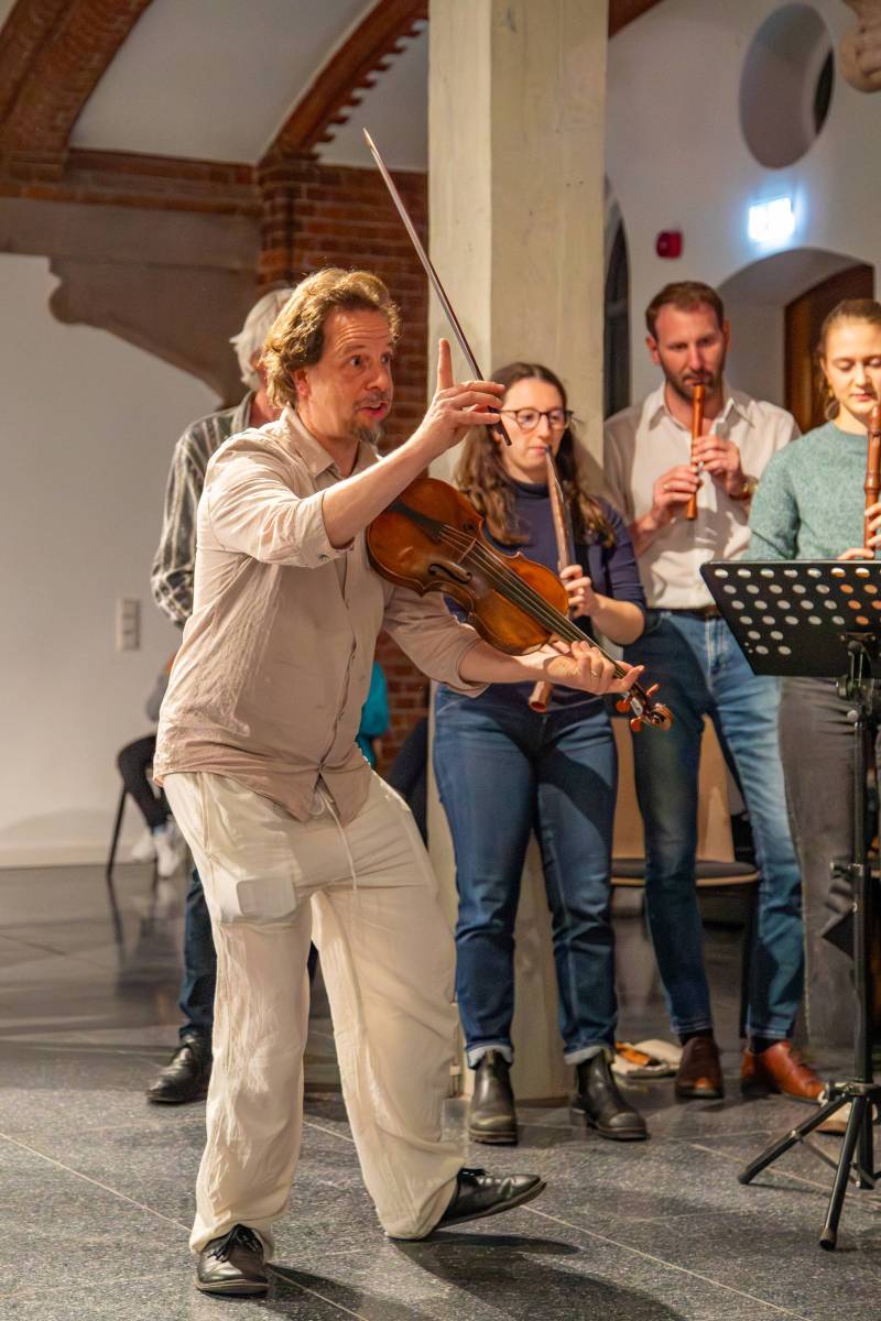Die historische Improvisation ist ein weites Feld und ihre Zugänge und Methoden der Vermittlung sind mannigfaltig. Das war in den insgesamt zwölf Workshops einmal mehr zu erleben. Als Teilnehmende konnte man sich täglich einen neuen der wechselnden Workshops und -dozenten auswählen, und so verschiedene Wege beschreiten, sich der historischen Improvisation im eigenen Tun anzunähern. Das wurde gern von Profis, Laien, Jugendlichen und Tanzinteressierten angenommen. Kein Workshop war überfüllt, sodass alle oft genug zum Zuge kamen und mit mehr Anregungen als umsetzbar im Gepäck die Heimreise antraten. Auch bei den beiden Sessions konnten sich alle Improvisationswilligen austoben, und so gab es zwei stimmungsvolle Abende mit den Sessionmastern Jostein Gundersen, Michael Spiecker und Mareike Greb, an denen sogar auch getanzt wurde. Auch Martin Erhardt konnte es sich nicht verkneifen, den einen oder anderen musikalischen Impuls zu setzen – sehr zur Freude des Publikums und zur Adrenalinerhöhung der Musizierenden.