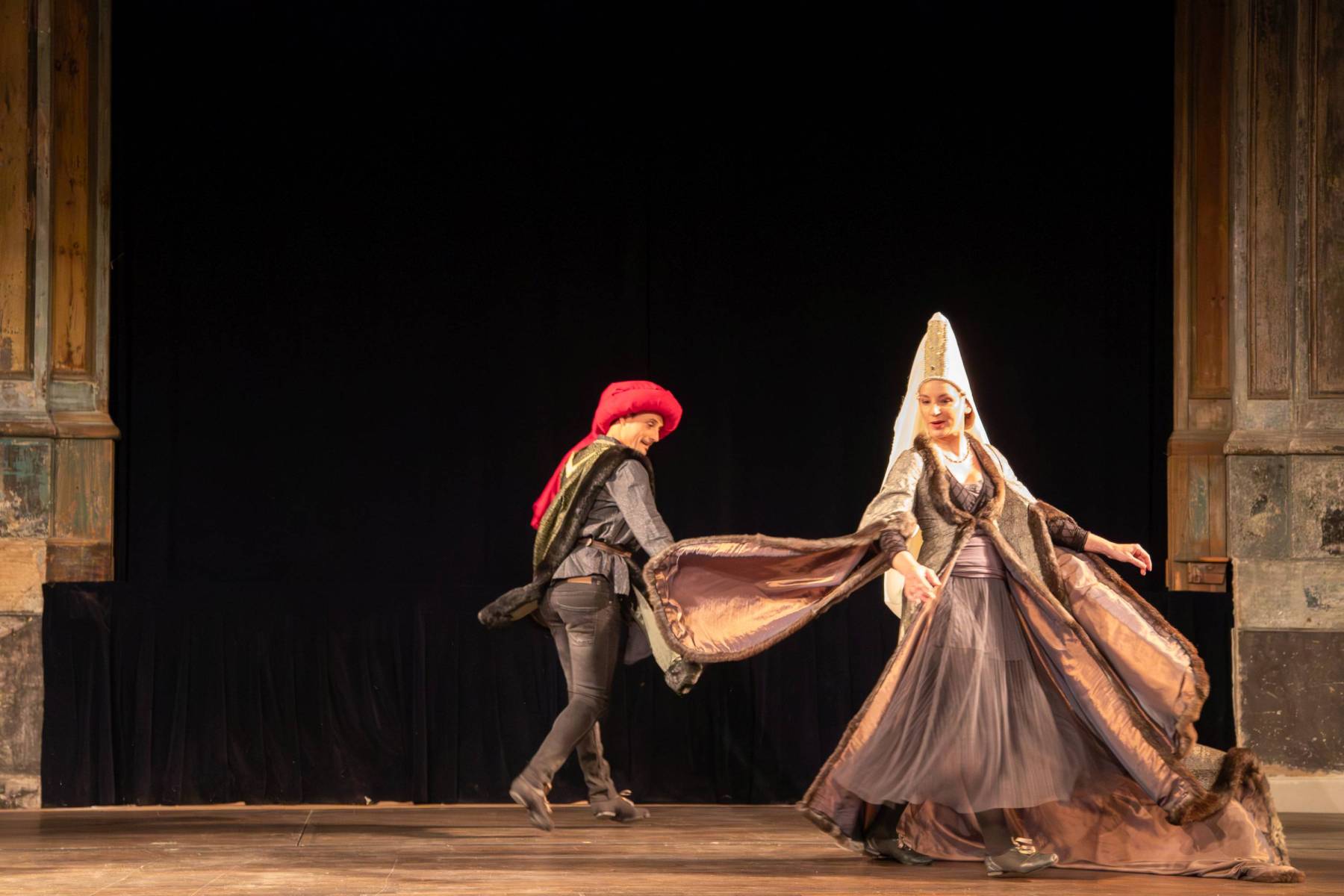 Während die Alta Capella (Josué Meléndez am Zink, Ian Harrison und Raffaella Bortolini an den Schalmeien und Catherine Motuz an der Posaune) mit Diminutionen zu einem harmonisierten gregorianischen Choral beginnt, kleiden sich zwei Tänzer – Mareike Greb und Hubert Hazebroucq – vor den Augen des Publikums am Bühnenrand in historische Kostüme. In wenigen Augenblicken werden wir in den Rhythmus ihrer improvisierten Basse danse hineingezogen und finden uns im 16. Jahrhundert wieder.