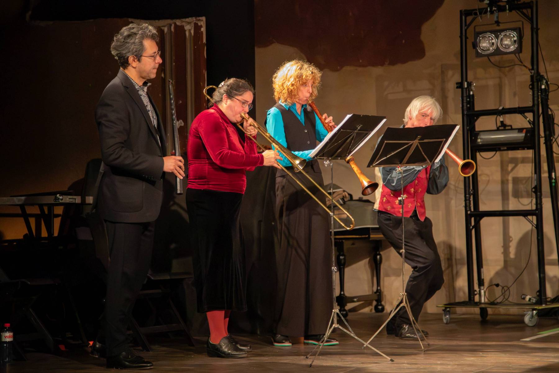 Dann folgt ein Moment der Verbundenheit mit dem Publikum: Ian Harrison „fischt“ Noten aus dem Saal. Fünf kommen dabei heraus: D, E, G, A, F. Er beginnt, sie zu spielen, gibt ihnen Rhythmus, und auf dieser Grundlage entsteht ein neuer Tanz. Catherine Motuz improvisiert eine Basslinie auf der Posaune, zu der sich bald der Zink in einem subtilen Kontrapunkt gesellt. Wir haben nun drei Stimmen.