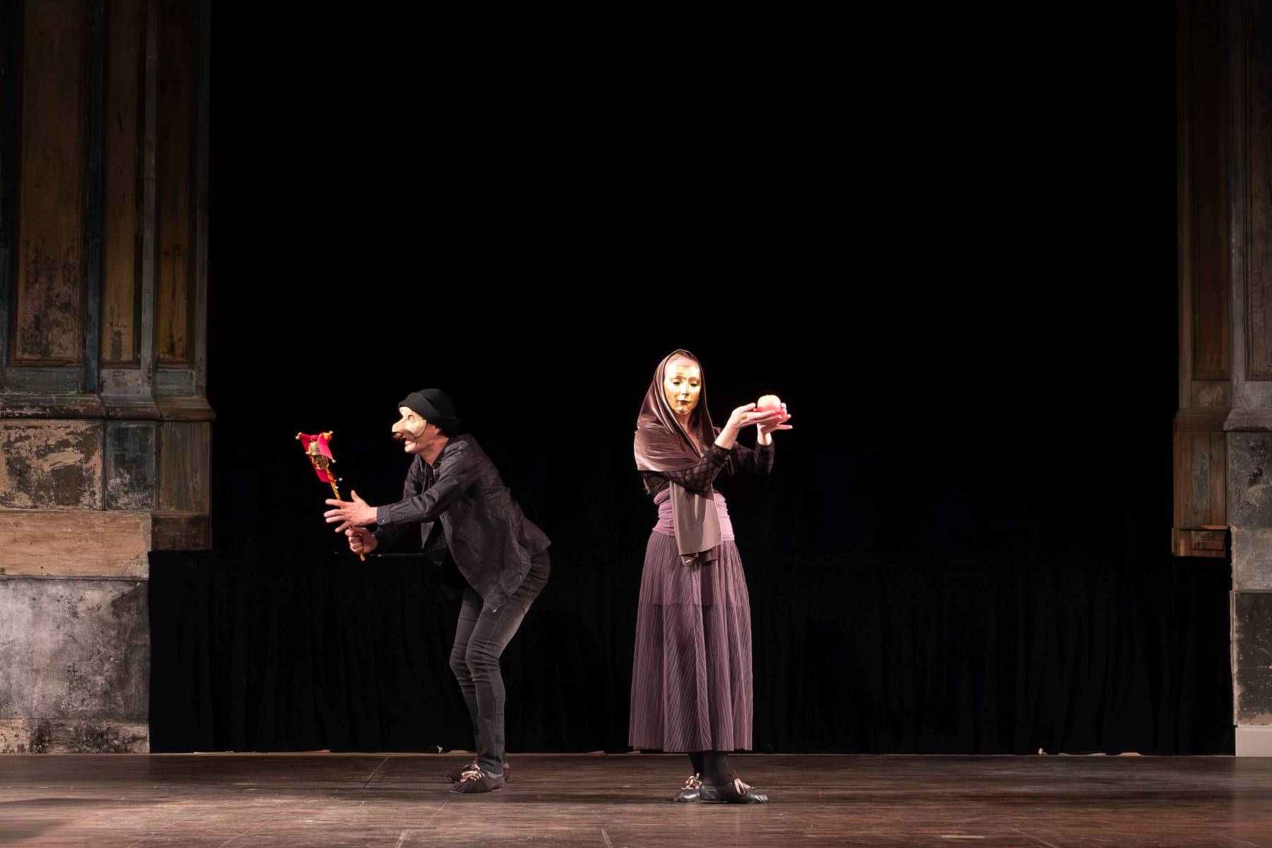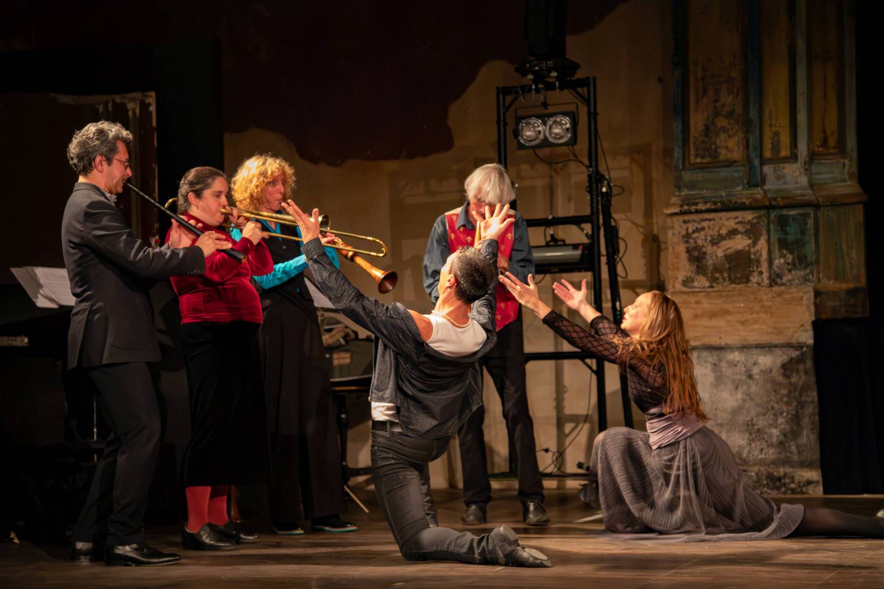 Die finale Gaillarde, die aus diesen fünf Noten entsteht, explodiert vor Virtuosität: Diminutionen auf dem Kornett von Josué Meléndez, Bass auf der Posaune von Motuz und improvisierter Tanz zu den Zeichen, die unten auf der Bühne angezeigt werden. Die beiden Tänzer spielen wunderbar mit ihrer Körpersprache, ergänzen sich perfekt in einer lustigen und einfallsreichen Choreografie.