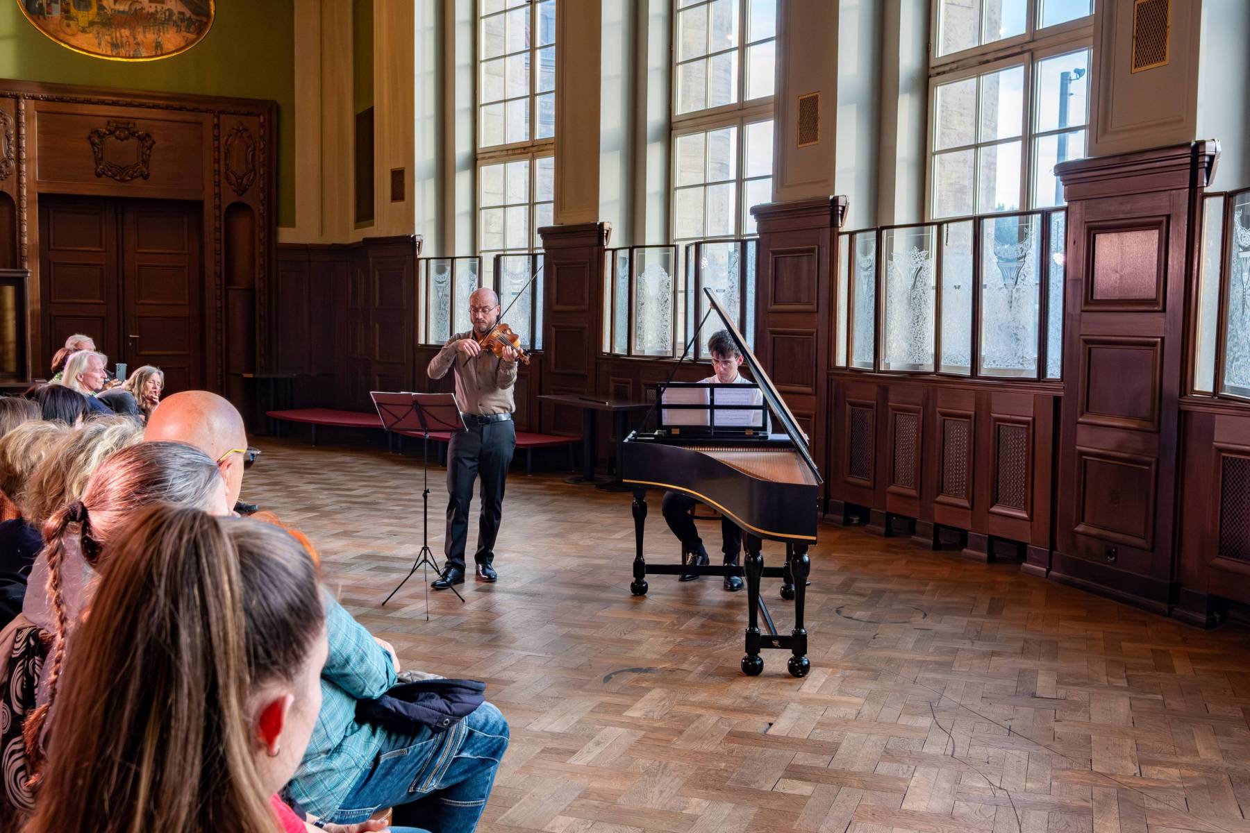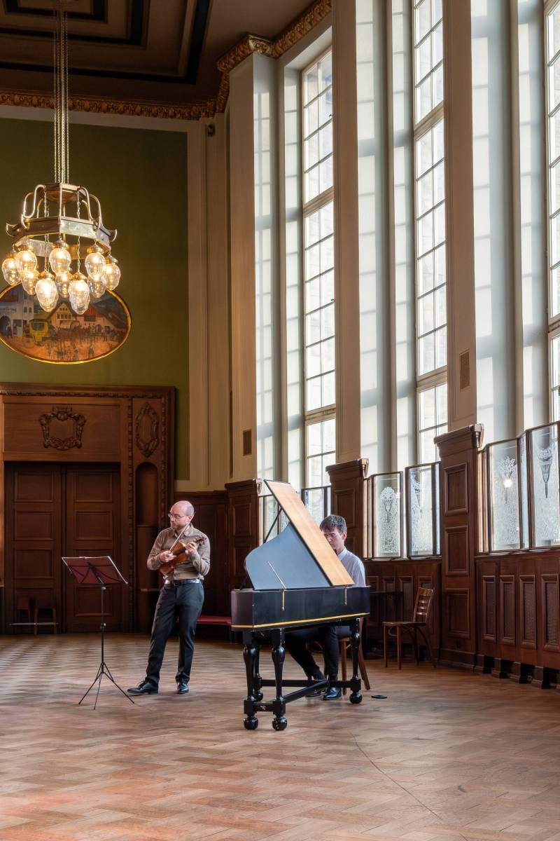 Welche Überraschungen würde uns das letzte Konzert wohl bereiten? Der Ort war, gelinde gesagt, unerwartet. Diesmal keine Kirche und kein Konzertsaal, sondern eine Adresse, die direkt aus einem Harry-Potter-Roman stammen könnte: Treffpunkt am Hauptbahnhof Leipzig, gegenüber Gleis 12, um zum Speisesaal zu gelangen, der hinter den Bücherregalen der Bahnhofsbuchhandlung versteckt ist. Wir befanden uns in einem schönen, überraschend ruhigen, hohen und gemütlichen Saal im Jugendstil, der bereit war, ein zahlreiches Publikum zu empfangen, das gekommen war, um den Improvisationen des Geigers Matthieu Camilleri und des Cembalisten Leonard Schick zu lauschen.