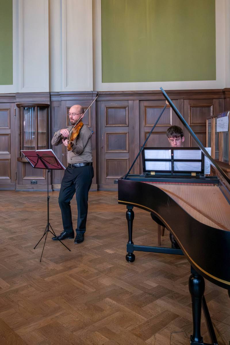 Nach einem improvisierten Präludium für Cembalo solo in d-Moll, dessen Affekt vom Publikum gewählt wurde – verliebt (natürlich unglücklich, laut Schick) –, bietet uns Matthieu Camilleri ein wunderschönes Violinsolo. Er führt das von Martin Erhardt komponierte Thema in einer Fuge aus und verbindet auf wunderbare Weise Polyphonie mit Doppelgriffen, subtilen harmonischen Verläufen und strikter Einhaltung des Rhythmus des Themas. Eine improvisatorische Meisterleistung, die das Publikum begeisterte.